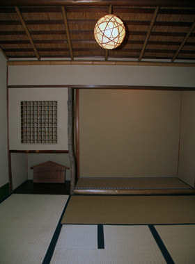 This teahouse was donated to the museum by Michihide Kujo. It was relocated from the premises of Marquis Kujo's residence in Akasaka, Tokyo. The colored landscape pictures by the Kano school adorn the paper pasted onto the interior walls, and the transom made of a single Chinese quince wood piece displays openwork of Japanese wisteria flower-shaped lozenges.