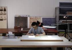 神庭: 当館の地下には様々な部署がありますが、保存修復課も本館の地下にあり、修理室も本館地下に集中しています。これからご案内する修理室は、日本やアジアの絵画や書跡などの美術品を修理する部屋です。伝統的な(そうこう)技術を用いて作品を修理しています。手前におりますのが、鈴木さんでこの道20年程のキャリアです。その後ろが沖本さんでこの世界で8年程のキャリアです。今2人が取り組んでいるのは、当館所蔵の書跡と絵画(両界曼荼羅)の修理です。