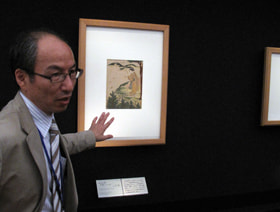 神庭: 本館の第10室は、浮世絵と小袖と、簪(かんざし)類、つまり江戸近世の町方の風俗を扱う展示コーナーです。こちらの面にありますのが、浮世絵ですね。向こうの面にありますのが小袖です。小袖と浮世絵が同じ部屋にあるのは、まさに近世町方の風俗を代表するものだからということの他に、保存的な観点から大切なことがあります。どちらも天然の染料を使っているということです。天然染料で小袖は染織されています。一方、浮世絵も天然染料を用いて刷られているんです。浮世絵は紙に天然染料、もちろん顔料も使っておりますけど、小袖は絹に天然染料、どちらも繊維に対して天然染料を使うということで、非常に似た性格です。いずれも光に対してとても脆弱な作品です。天然染料は強い光に当たると褪せて消えてなくなり易いものです。浮世絵と小袖が一緒に置かれていることは、どちらもある程度の暗さに置くということで、保存の観点からもとても良いコーナーになっているのではないかと思います。