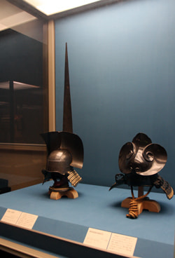 白糸威一の谷形兜(しろいとおどしいちのたになりのかぶと)、徳川家康から初代水戸藩主となった子の頼房に伝えられた兜(左)。黒韋素懸威如意頭形兜(くわかわすおどしにょいがしらなりのかぶと)、蝶型、葵葉形ともいわれ、仏具の如意の雲形にも似ている。(右)