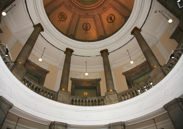 表慶館は、ネオ・バロック様式の建物ですが、平成13年(2001)頃から雨漏りや老朽化が進んだため、平成18年(2006)に大規模な改修が行われました。その際に、展示室内も、クリーム色の壁面、柱は白色、木製のドアの建具部分は薄い緑色へ修復され、創建当時の姿が蘇りました。同展示室では、東洋の彫刻、工芸、考古遺物が展示されています。(これらの作品は、現在は展示されていません。)