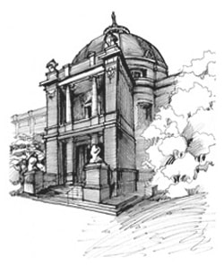 建物の正面外壁の上部には、製図用具や楽器をモチーフとした装飾が配されています。