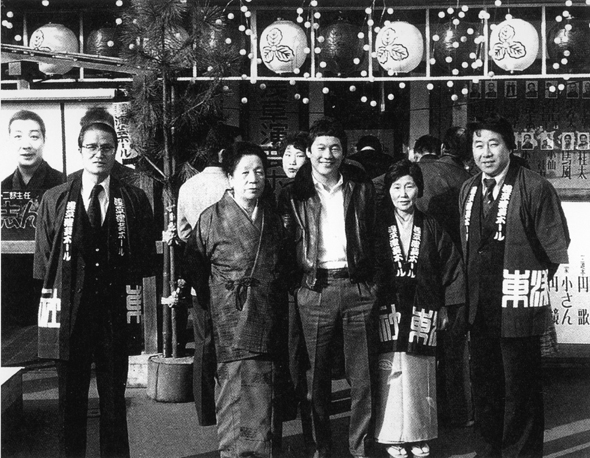 北野武(中央)和现浅草演艺厅会长松仓(左)等工作人员在一起(东洋兴业株式会社提供)
