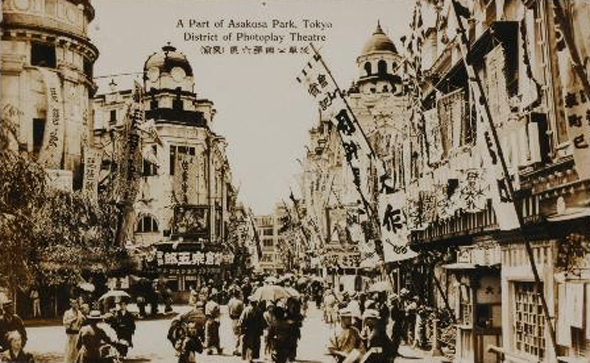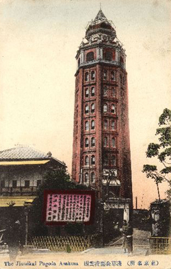 Ryounkaku (Asakusa Junikai) seen on the right side. The picture seems to be shot before the Great Kanto Earthquake in 1923.