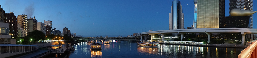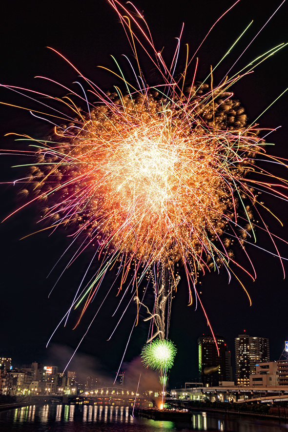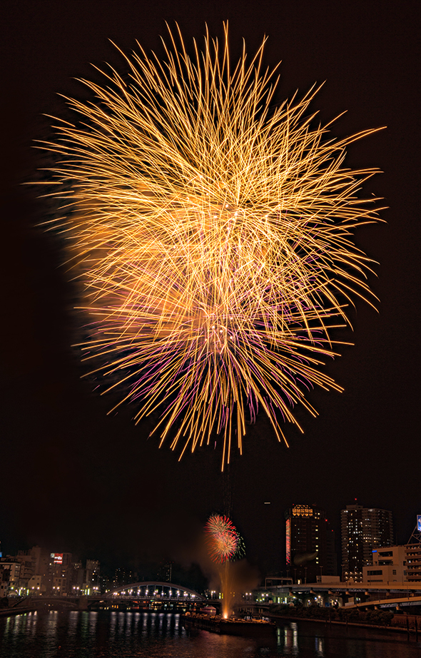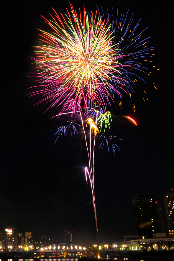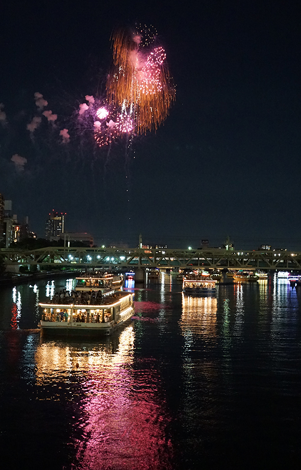 每年在7月末舉行隅田川焰火大會時,都會有近百萬人參加,這在東京都內各地舉辦的焰火大會中也屬于大規模的,當天還有電視台進行實況轉播。燃放焰火被分爲兩個會場,在隅田川上的櫻橋和言問橋之間設立的是第一會場,在駒形橋到廄橋之間開設的是第二會場,兩個會場交相呼應地競相將焰火投向夏夜高空,還進行焰火比賽。從1978年(昭和53)到現在共舉辦過40回了,隅田川焰火大會已經成爲東京夏天一道絢麗的風景
