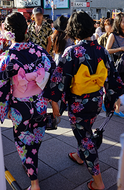 大街上人們穿著色彩紛呈的浴衣(注:棉布質地的夏天薄和服)爭芳鬥豔。
