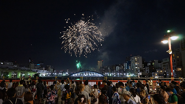 It is said that Sumida River Fireworks Festival derived from a water god festival held by General Yoshimune Tokugawa at the foot of the Ryogoku Bridge in 1733, in which fireworks were shot off in order to appease souls of people who died from famine and cholera. Although the festival was temporarily suspended at the times of the Meiji Restoration and the Second World War, it marked its 40th anniversary in July 2017 since its name was changed to "Sumida River Fireworks Festival" in 1978. (Area around the Sumida River, Asakusa and Mukojima)