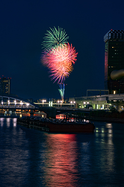 매년 7월에 개최되는 스미다가와 불꽃 대회는 도쿄의 불꽃놀이 중에서도 매회 100만 명에 가까운 인파가 몰리는 큰 행사로써, 방송으로 생중계도 이루어지고 있습니다. 스미다가와에 놓인 사쿠라바시부터 고토토이바시 사이에 설치된 제 1회장과 고마카타바시에서 우마야바시 사이에 마련된 제 2회장의 두 곳에서 경연이 이루어지는 불꽃 콩쿠르가 개최됩니다. 재개된 쇼와 53년(1978)부터 40회째를 맞이하면서 도쿄 여름의 풍물이 되었습니다.