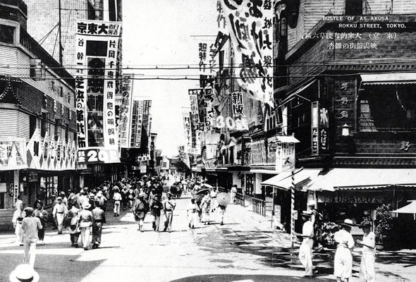 從古代的江戶開始,到淺草來尋求娛樂的人們就絡繹不絕。明治6年(1873)淺草寺廟區域成為公園,到明治17年(1884)被分為六個區域,隨後很多演出劇場都遷到淺草寺西側的六個區裏。後來,這裏逐步發展成包括曲藝,攝影和淺草歌劇在內的娛樂街。六區周邊也不斷建成了很多娛樂設施,包括富士觀覽場、全景館、淩雲閣(12層)等,其中在嘉永年間(1848-54)開園的遊園地極具人氣,雖然開始僅僅能夠欣賞季節花卉,從明治時期開始又增設了各種演出和動物園。
