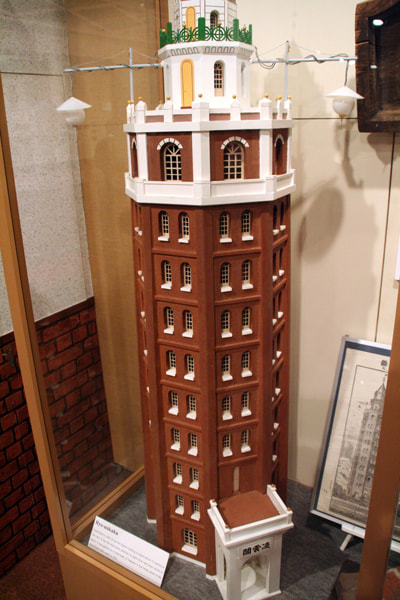 淺草淩雲閣(共十二層)在明治23年(1890)年開業,由英國建築師博爾頓(William Kinnimond Burton,1856-1899,在日本度過了其職業生涯中的大部分時光)設計。建成時的高度據說是220尺(約67米),在明治末期進行的實際測量中被證實其實際高度為173尺(約52米),是當時日本最高的建築物,同時也是日本最早設置了電梯的建築,被稱為淩雲閣。它作為淺草的標志性建築受到大家的喜愛,後來在大正12年(1923)關東大地震中倒塌。(照片:大正時代)