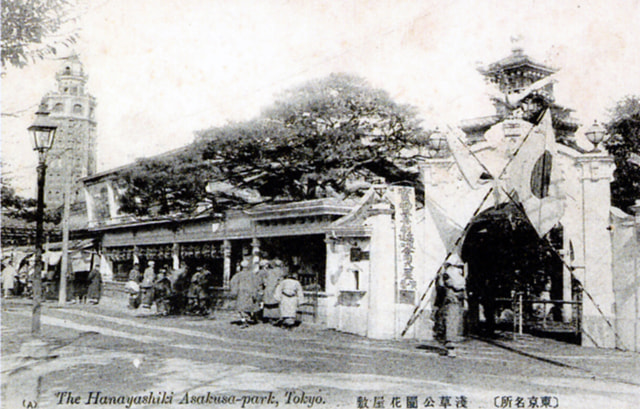 明治末期的游园地“花屋敷”,后方右侧的建筑物是五层的“奥山阁”,在明治21年(1888)年从富商的宅邸内迁移到此,后方左侧可以看到凌云阁。照片下方的英文标注显得很时髦。(照片:明治后期)