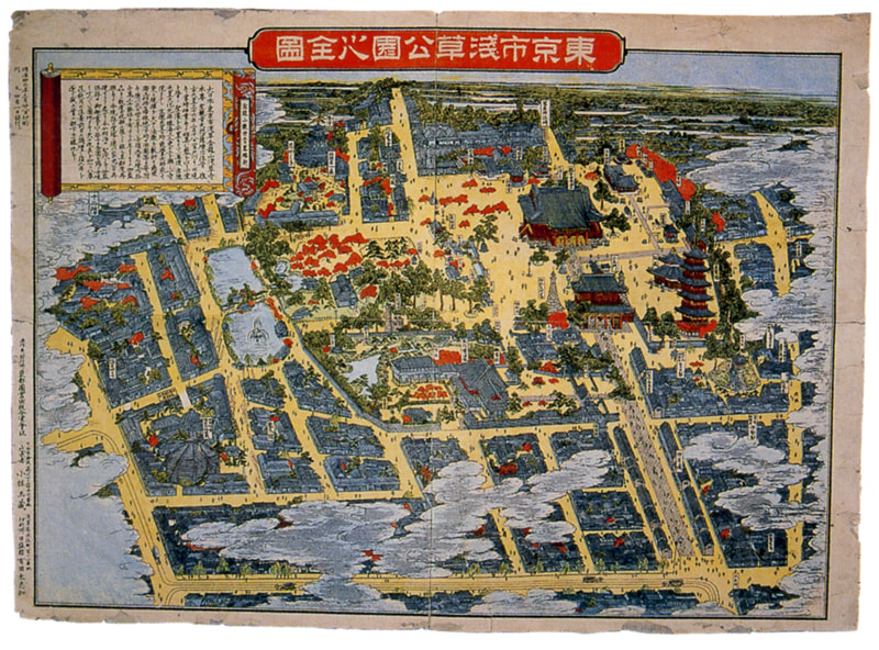 地图中描绘了当时浅草公园的样子,包括凌云阁、全景馆、演出街、游园地、商店街等,地图的下侧可以看到马车和铁道。
