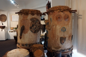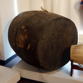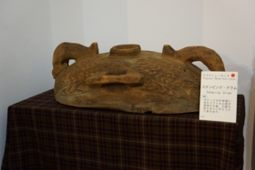据说是婚礼时使用的太鼓。现在的贝宁在婚礼仪式上使用的太鼓,鼓上面分别雕饰着男性女性器的形状,有祈求夫妇和合、长寿和子孙兴旺等意思的寓意。