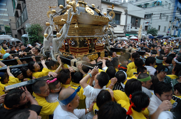 傍晚,隨著夜幕降臨,人們點著了裝點在千貫神輿上的燈籠,也因此步入了被稱為祭禮活動高潮的“宮入”(意為神轎回歸神社),最後由和睦會的人親手將神轎歸還神社。在周圍觀衆的注視下,伴隨著夜幕中搖曳的燈籠光,神轎緩緩移動,這也成為了一天祭祀活動的壓軸戲,極具地方風情,它已成為描述傳統街區民俗的風景詩。祭禮活動有方方面面的人參加,主要以“氏子敬神會”和“ 鳥越神社十八街和睦會”為中心,他們主持掌管著祭禮活動的所有事情,他們祖祖輩輩,父子二代,祖孫三代,代代相傳的繼承著這個傳統。