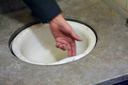 洗手间的洗手盆没有排水口,将洗手盆拉起来进行排水的形式还是很罕见的。