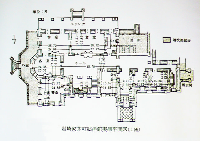 Well, it had a great influence. Although, in the first draft, British architect Josiah Conder planned to build the residence with stones and bricks, Hisaya stuck with wood construction. The first to fourth drafts are preserved, but strangely, there is no final draft. The roof shape of the present-day building is slightly different from that on the fourth draft which is owned by Mitsubishi Estate Co., Ltd. Buildings are usually enlarged and rebuilt after their completion, so the shape is different from that on the final draft.(continued in the lower column)
