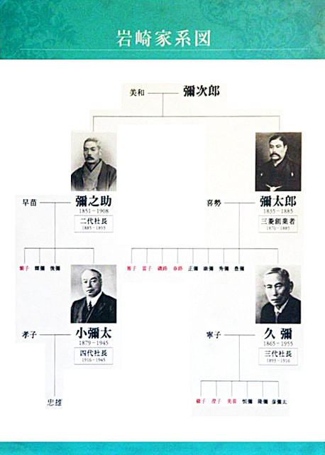 It starts from Yajiro, the father of Yataro Iwasaki of the Mitsubishi financial combine founder. And it leads to Yanosuke of the second president, Hisaya of the third president and Koyata of the fourth president.