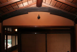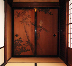 The tokonoma in the Japanese-style house: Most of the wall paintings, including paintings on fusuma sliding doors and panel paintings, are works by Gaho Hashimoto, a great master of Japanese-style painting in the Meiji Period.