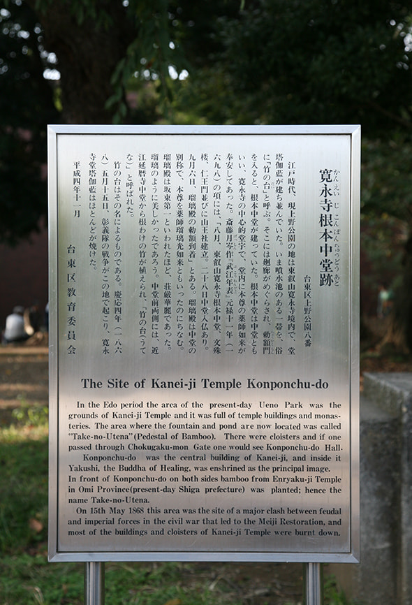 在上野公園到處都可以看得到曆史時代變遷的足迹。在政權歸還之際,同新政府軍對峙過的彰義隊的墓地,和曾經是幕府征討軍參謀的西鄉隆盛的銅像(明治31年(1898),高村光雲作,愛犬“聰”,後藤貞行作)比鄰相接,氣氛隱然。