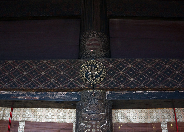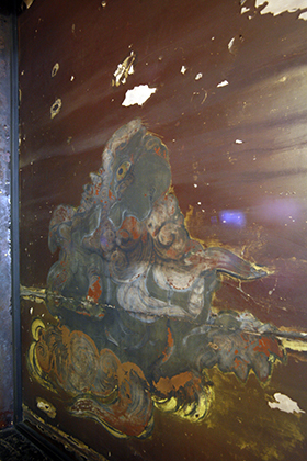 Ceilings and transoms in Shakado are blackened because sacred fire is lit at fete days of Daikokuten. Unfortunately, a mural that is said to be painted by Shigenobu Kano has also deteriorated. I think a Chinese-style lion and peony are depicted in the painting. The image of Aizen-myo-o painted on silk fabric, which is designated as an important cultural property, is deposited in Tokyo National Museum.