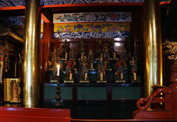 清水観音堂は、上野戦争の戦災も免れましたが、永年の焼香等で堂内は黒くくすんでいましたが、平成2年(1990)の解体・修復工事を経て、元の朱と黒、そして金色の色鮮やかなコントラストが蘇りました。