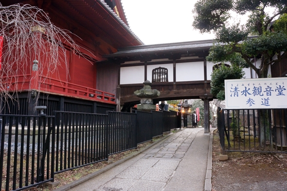 기요미즈 관음당은 간에이 8년(1631) 건립 당시에는 현재의 위치에서 백여 미터 북쪽인 스리바치 야마(현 도쿄 문화회관 서쪽 언덕)에 있었지만 겐로쿠 7년(1694)에 이축되어 현재에 이르고 있습니다. 본당은 도리가 5간에 대들보가 4간이며, 단층 팔작집 기와 지붕의 무대구조입니다. 특히 시노바즈노이케를 바라보는 정면의 무대 구조는 에도 시대에 우키요에로 그려져 유명한 경관이 되었습니다. 헤이세이 2년(1990)부터 전면적인 해체와 수복 공사가 실시되어 헤이세이 8년(1996) 5월에 완성되었습니다. 이 공사를 할 때 이축 연대가 겐로쿠 9년(1696)이던 정설을 뒤집는 겐로쿠 7년(1694)의 건축기록이 새겨진 패가 발견되었습니다.