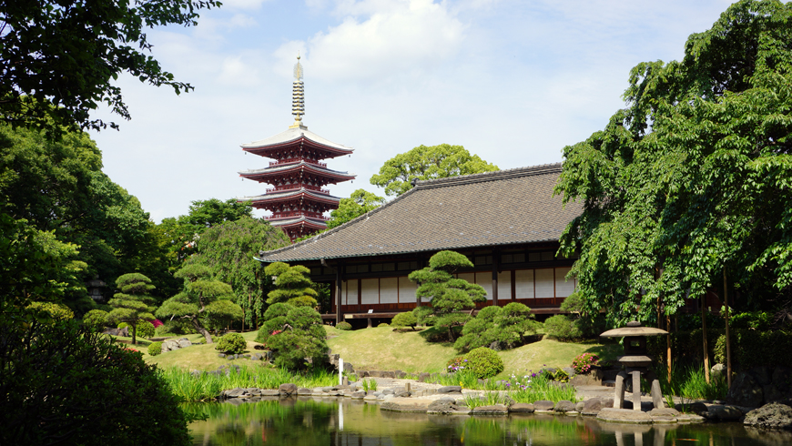 傳法院庭園是一座不公開秘園,不光是建築,這裏的植物和自然環境也都具有寶貴價值。現在,庭園的背景中又增添了東京天空樹(2012年竣工的東京新電視塔,高634米),展現著新與舊的完美結合。