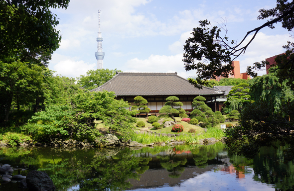 永らく秘園とされていた伝法院庭園。建築物だけでなく植栽や自然環境も貴重なものとなっています。現在では、庭園の背景に東京スカイツリーを望み、新旧の調和を成しています。
