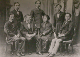 前列左から、芝葛鎮(しばふじつね)、メーソン、中村専、辻則承(つじのりつぐ)、後列左から、東儀彭質(とうぎたけたか)、上真行(うえさねみち)、奥好義(おくよしいさ)