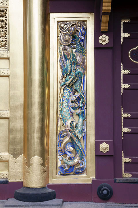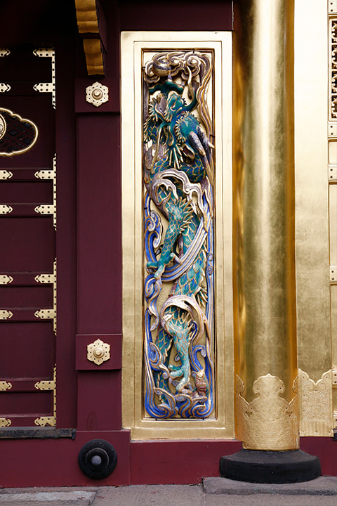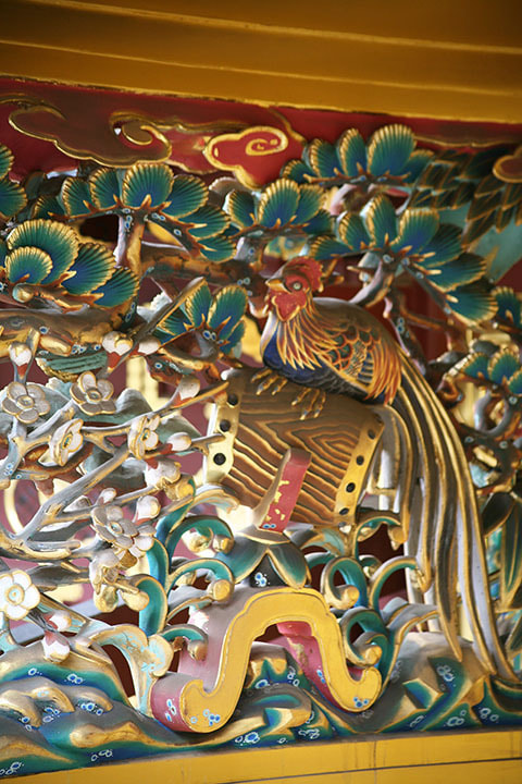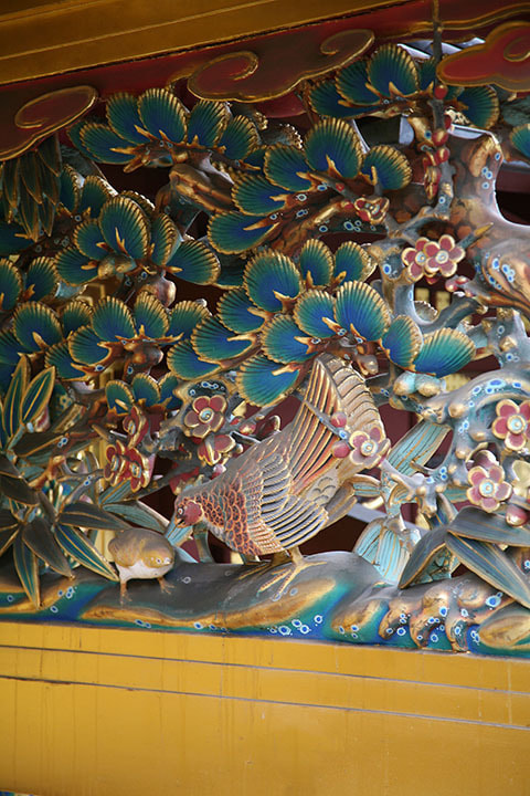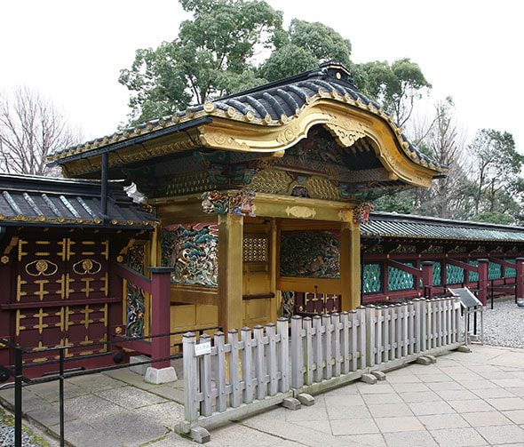 正式名称叫做〔唐破风造四脚门〕,是国家指定重要文化遗产。门的两侧是江户时代初期的雕刻师左甚五郎作的升龙和降龙,门的上部装饰着镂雕,雕刻着锦鸡鸟和银鸡鸟。在门的内侧,雕刻着来自中国典故中的谏鼓鸟。