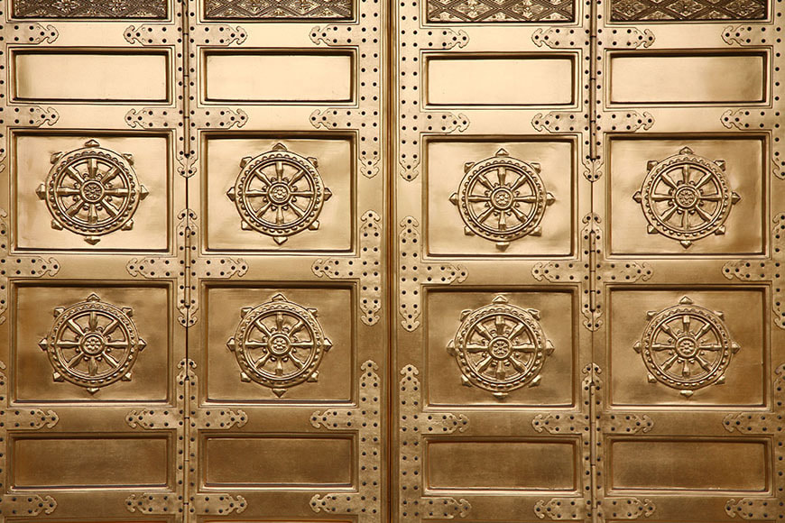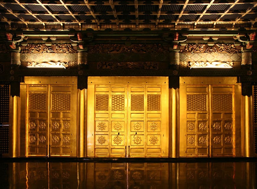創建当時から、今日と同じく数十年に一度の修復が行われていたとのことですが、明確な記録の多くは残されていません。近年の修復は、平成21年(2009)から平成25年(2013)までの5ヶ年をかけて行われ、創建当時の金色が色鮮やかに蘇りました。