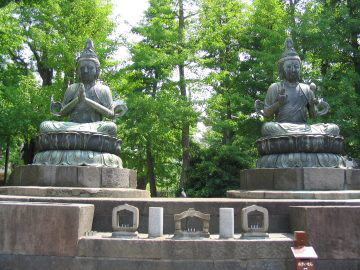 The two Statues are: Bodhisattva Avalokiteshvara on the right and Bodhisattva Seshi on the left. They are both 2.36 meters in height. In 1687, Takase Zenbee from Tatebayashi, (present Gunma Prefecture) made these statues to repay the debt of gratitude to the rice wholesaler family who helped him, the Avalokiteshvara for the father and the Seshi for the son.