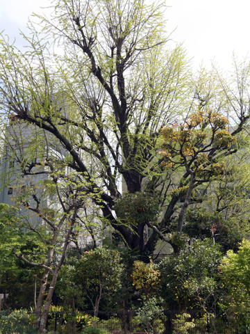 蓬莱園は、寛永9年(1632)に肥前平戸藩主松浦侯のために、小堀遠州が造営した名園です。池泉は校庭として埋め立てられ、わずかに北東の隅にその面影が残っています。このイチョウはその当初からあったもので、高さ約21.3メートル、幹囲約4.8メートルあります。