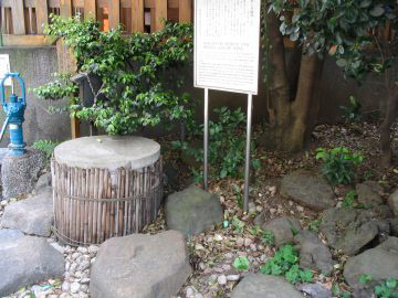 社殿北側の井戸は、源義経とその従者が奥州へ向かう途中に弁慶が見つけ、一行ののどをうるおしたと伝え、『江戸志』など江戸時代の史料にも名水として記録がある。一時埋め戻したが、昭和15年(1940)に再び堀り出し、とくに昭和20年(1945)の東京大空襲などでは多くの被災者を飢渇から救った。井戸脇の石碑は掘り出した際の記念碑で、造立者の中には当地に住んでいた画伯横山大観の名も見える。