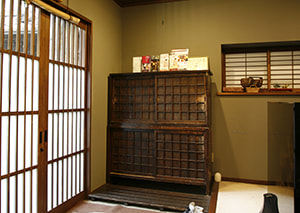 A shoe cupboard placed at the entrance is the one used by Ogai. It is a very old shoe cupboard, and was allegedly made in around 1886. No nail is used for the shoe cupboard.