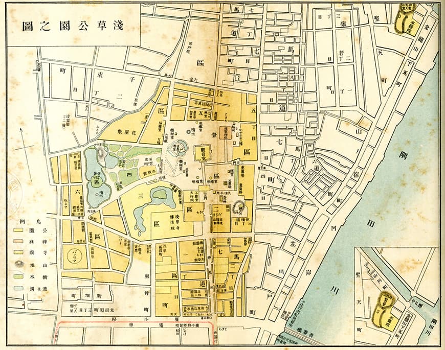 In "Vita Sexualis," a character crossed the bridge when returning to Kosuge. It is said that there was a triple bridge across the Shinobu River near an intersection of Chuo and Shinobazu Streets. [no longer extant]