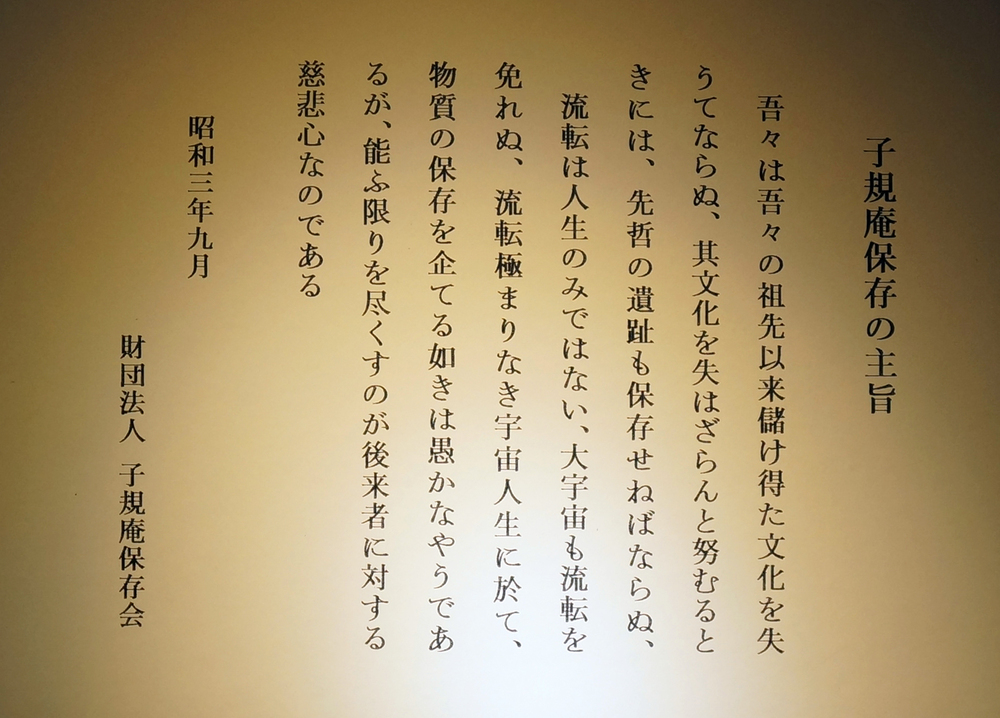 "The intended meaning of preserving Shikian," which seems to be drafted by Sokotsu Samukawa, is put on the wall of Shikian.