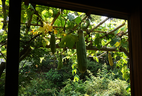 子規が病床に伏していた六畳間からは、ガラス戸越しに今も変わらずたわわに実った糸瓜の棚の青々とした風景が見えます。