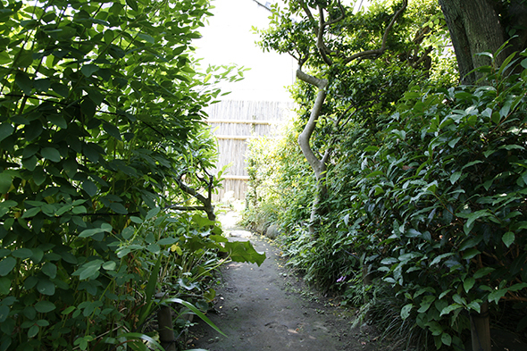 左手の棚は、明治34年6月に植木屋を呼んで作らせた糸瓜棚。現在の糸瓜棚の2倍程の大きさでした。正面の南側の生け垣には木戸があり、左手奥に上野の山が見えます。