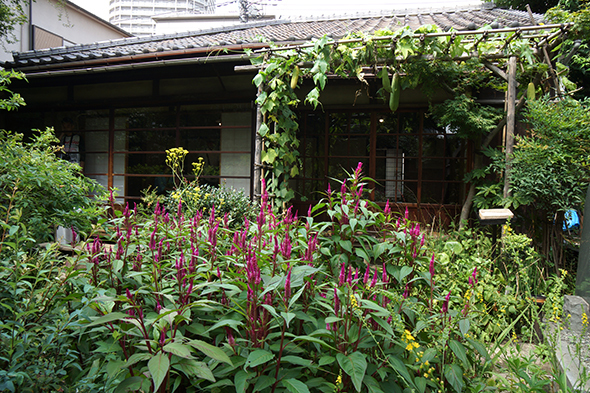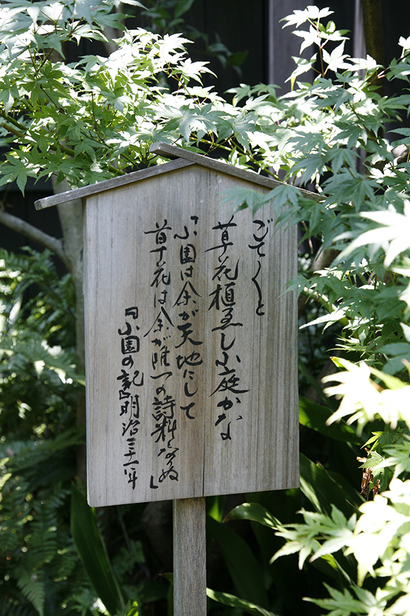 明治31年(1898)、子規は俳句雑誌「ホトトギス」に「小園の記」と題して子規庵の庭についての随筆を載せています。「我に二十坪の小園あり。」という冒頭に続き、転居した当初は、竹藪を切り開いた草木も乏しい裸の庭であったと記し、家主が小さな松を三本植えくれたり、隣の老女からもらった薔薇(バラ)の苗を植えたことを記しています。その薔薇が四五輪咲いた時は、句や歌を詠む気力を奮い立たせてくれたとも述べています。朝顔が終わる八月の末頃に、待ちに待った萩の花が一つ二つとひらくと、「飛び立つばかりの嬉しさ」だと表現し、秋になれば風の影響が心配だなどと、庭の様子が見えるような文章です。小さな庭の草木の成長が、子規の文学と病の日々を支えていたことは、「小園は余が天地にして草花は余が唯一の詩料となりぬ」の件(くだり)にも偲ばれます。随筆の終わりに俳句があり、現在の子規庵の庭と通じています。
