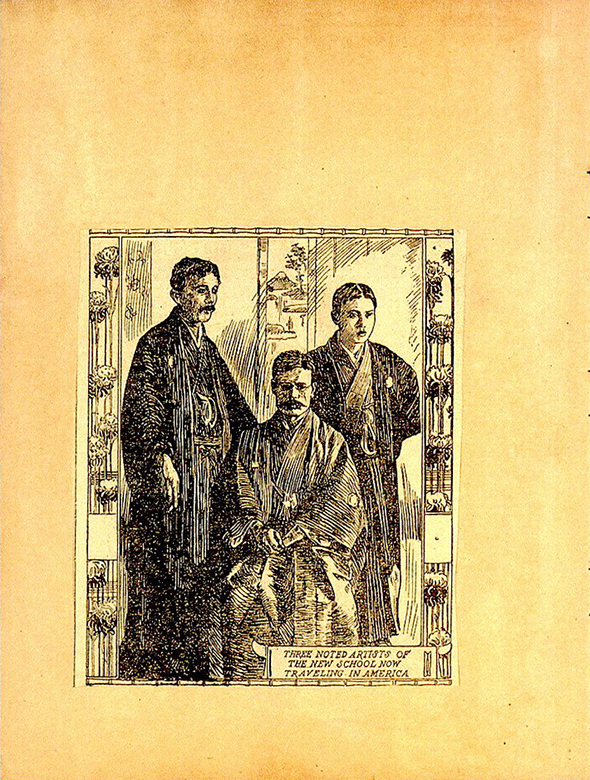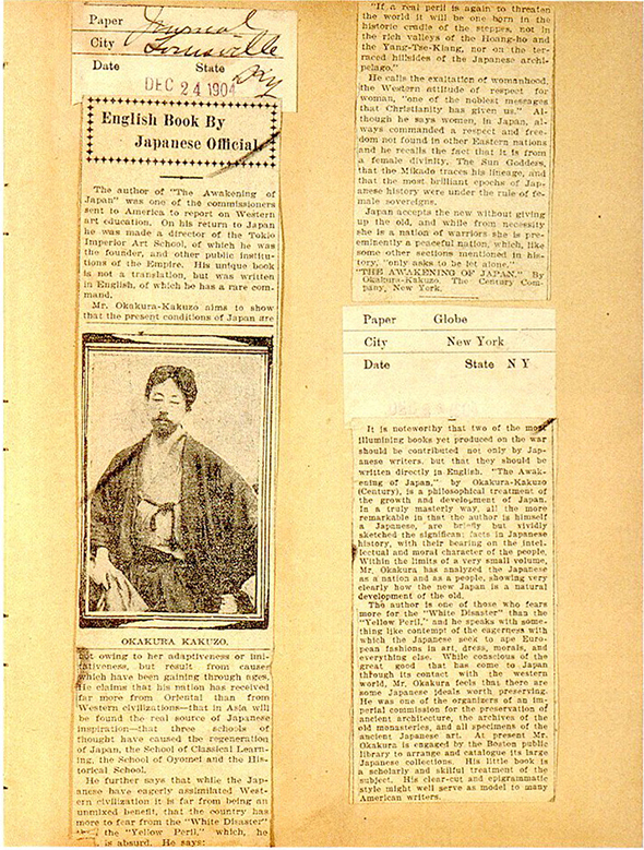 从哈佛大学寄来的天心出席文学修士“Masters of Arts”学位授予式时的新闻报道,新闻报道的左右空白上的字是天心的弟由三郎写的。