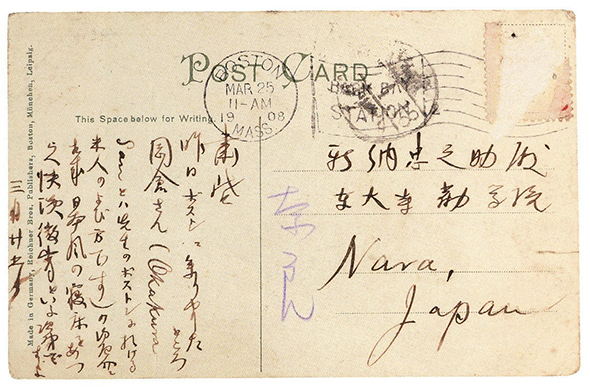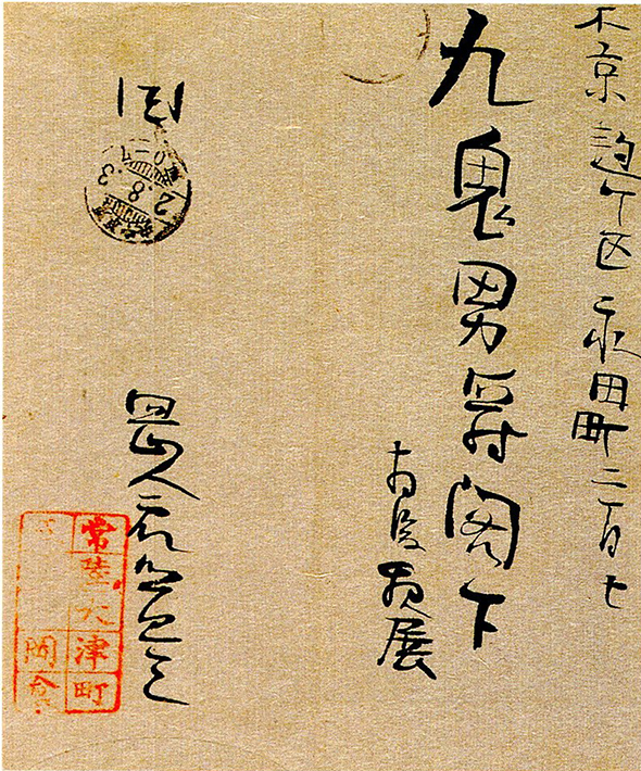 이바라키현 이즈라로 옮긴 후의 서한. ‘히타치노쿠니 오즈마치 이즈라 오카쿠라 카쿠조’라고 쓰여 있습니다.