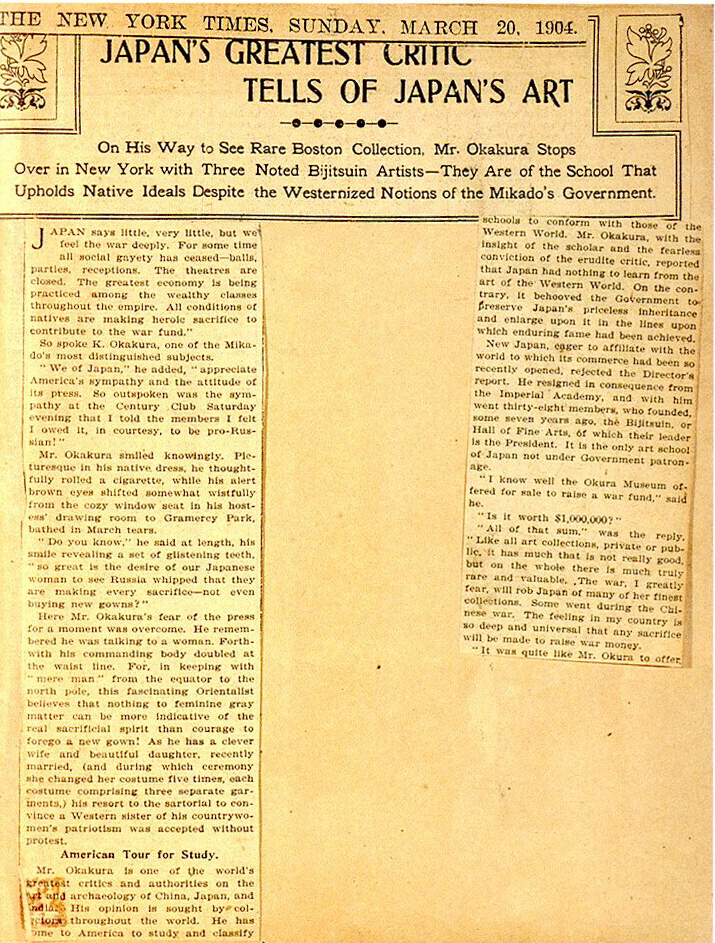 텐신과 함께 미국으로 건너간 다이칸, 슌소는 미국 각지와 유럽을 돌며 전시회를 개최했습니다. 이러한 활동을 전하는 신문기사를 수집한 신문기사 절취첩은 표지를 포함해 52페이지로 구성되어 있습니다. 텐신의 미국 체류기간 동안 출판한 「The Awakening of Japan」나 신문 논설 「Japan and the 'Yellow Peril'」등의 귀중한 자료가 포함되어 있습니다.