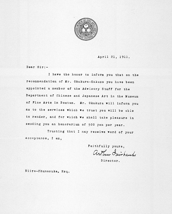 보스턴 미술관 관장인 페어뱅크스의 서한에는 텐신이 니이로를 새로운 보스턴 미술관의 중국/일본 미술 부문의 고문으로 추천했으며 이를 승인하고 위촉한다는 내용이 쓰여 있습니다. 그리고 같은 날에 텐신은 니이로를 추천하였으며 이에 승낙을 하라는 취지를 전하고 있습니다.