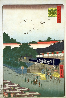 Hiroshige Utagawa depicted the bustle in front of Toeizan Kan-eiji Temple's gate, which was titled "Ueno Yamashita," one of the "One Hundred Famous Views of Edo." The inside of "Iseya," a restaurant, can be seen in the picture. It seems that visitors to Kan-eiji Temple, who are on their way home, are depicted. "Torii," or an archway to Gojotenjin Shrine, next to Iseya can be seen.