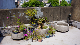 房顶上的眺望视野开阔,还摆放著花卉盆栽。