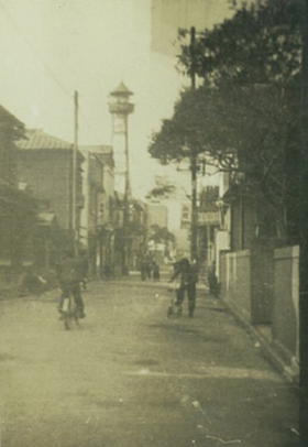 从上野下公寓前面的道路眺望消防站的消防瞭望楼